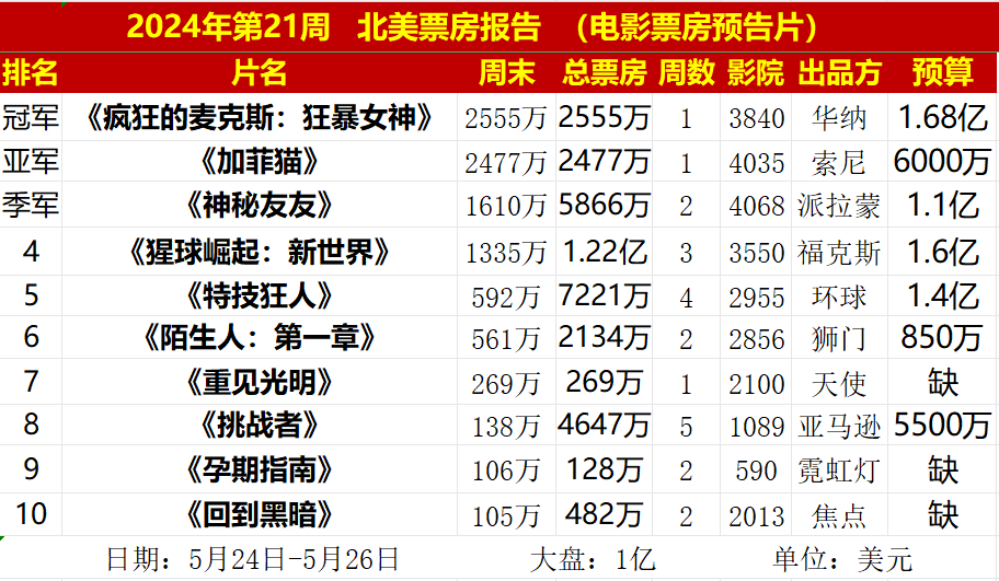 在众多影片中,《疯狂的麦克斯:狂暴女神》作为华纳兄弟影业的年度重磅作品,首周末票房仅为2555万美元,虽然险胜《加菲猫》夺得周票房冠军,但这一成绩与预期相去甚远。该片的全球首周末票房为5880万美元,面对1.68亿美元的预算成本,收回成本的压力巨大。