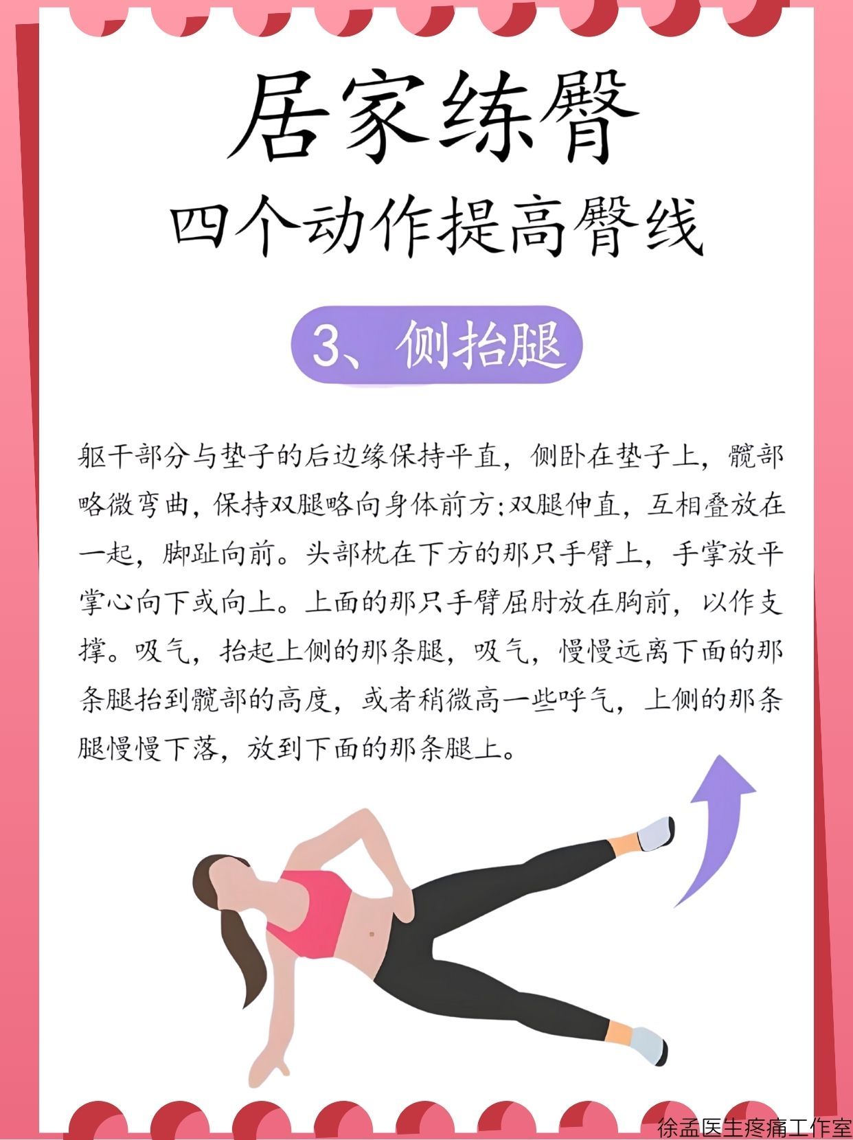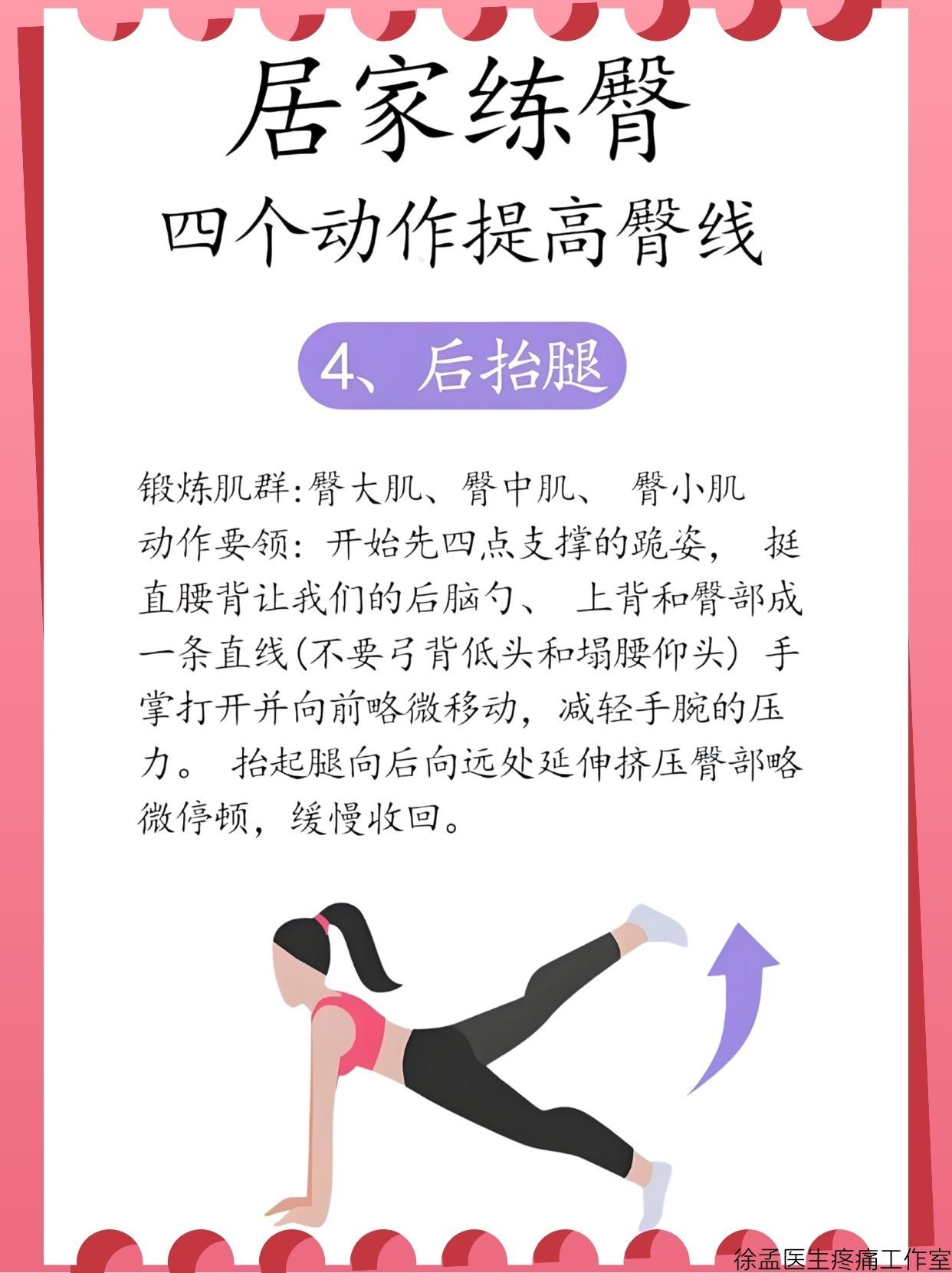 后抬腿,俯卧于床或垫子上,双腿伸直,一条腿缓慢向上抬起,至最高点停留片刻再放下,可强化臀部后侧肌肉。