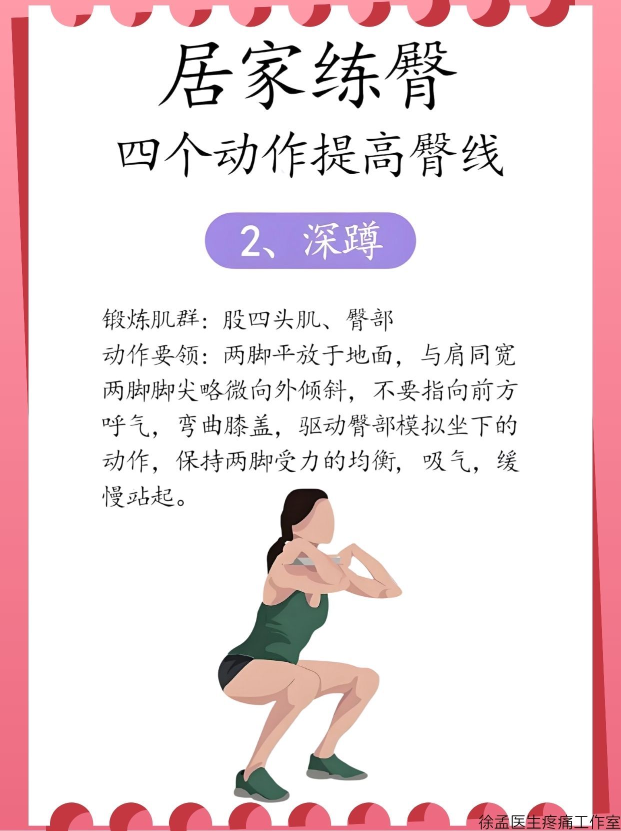 深蹲,双脚与肩同宽,缓慢下蹲,如同坐在椅子上,注意膝盖不超过脚尖,再起身站直,此动作可锻炼整个臀腿肌肉群。