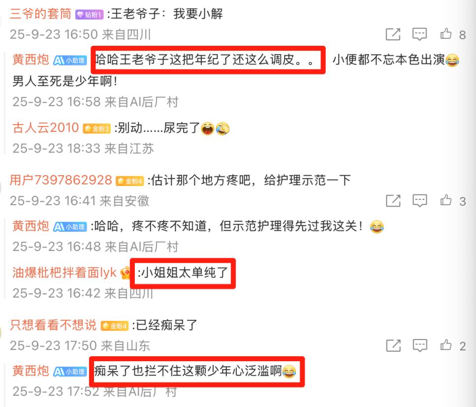 有人说,老爷子这把年纪了还这么调皮,不忘本色出演。还有人说,这个躺在病上了,也挡不住这颗少年心的泛滥。还有网友说,小姐姐(女护工)太单纯了。