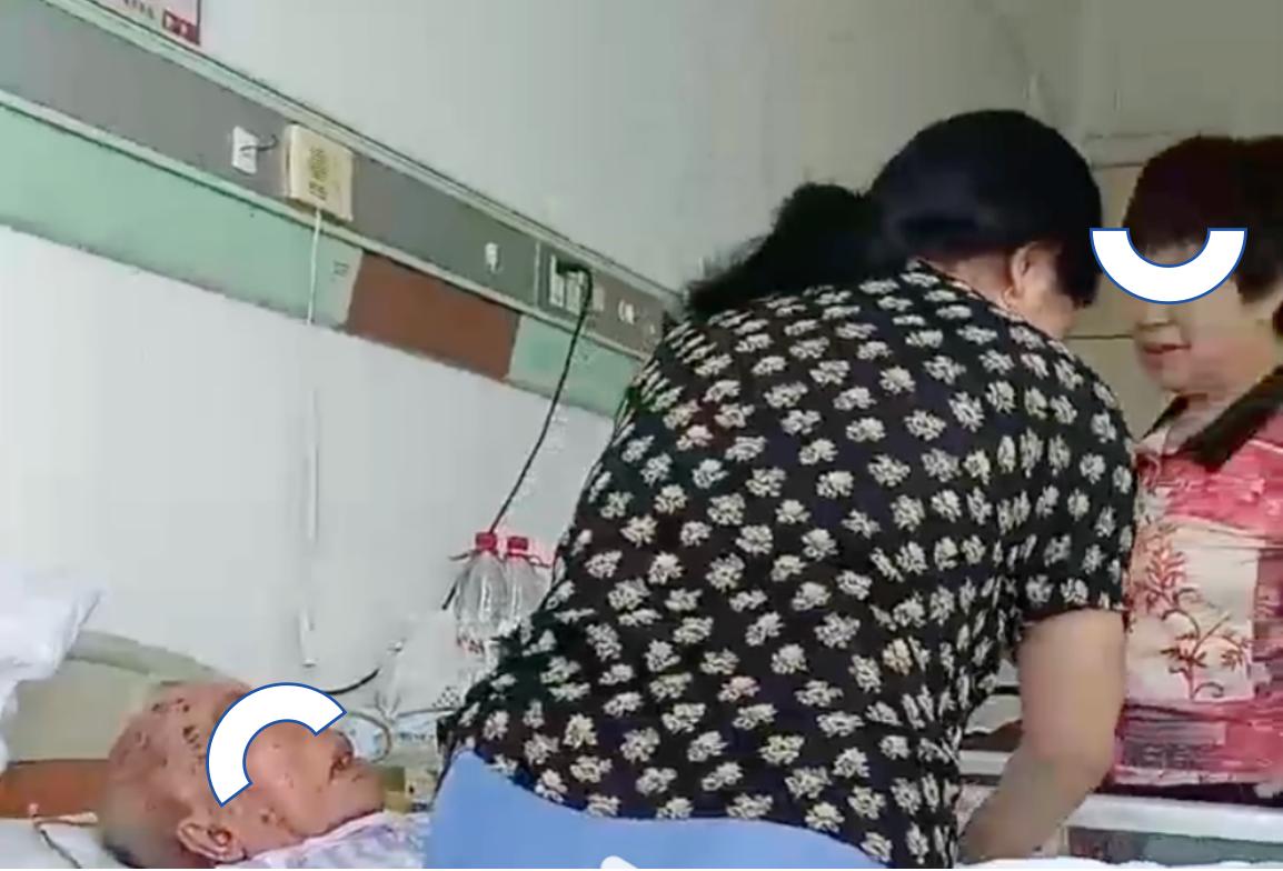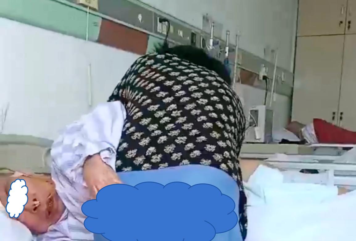 直到一个短发的中年女子出现,疑似老人的女儿,进到病房,走进老人床位,对着老人尴尬地笑,说了一句,“你这个谈色gui。”视频画面到这里就结束了。