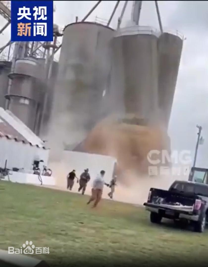 美国马丁顿镇一座27米高的混凝土粮仓突然崩塌