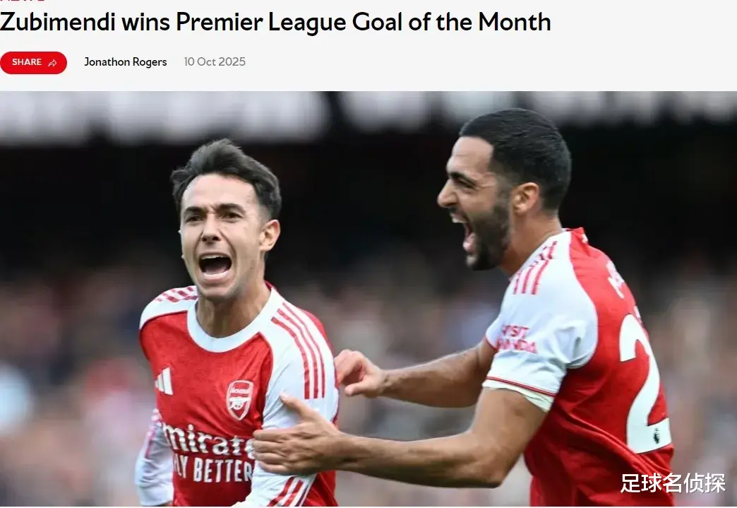 官方:祖比门迪对诺丁汉森林的比赛中打进的凌空球被评为了英超9月份最佳进球!