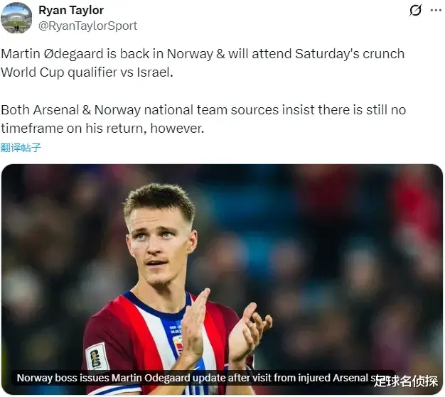 索尔巴肯表示,他们在周四与厄德高共进了午餐,而这名球星也会去现场观看挪威对以色列的世预赛关键战,不过镜报和伦敦足球记者RT指出,截至目前,阿森纳和挪威都还不愿给厄德高的复出确定一个清晰的时间表,但接近国家队的挪威媒体认为,厄德高此番重返祖国也是个积极的信号。