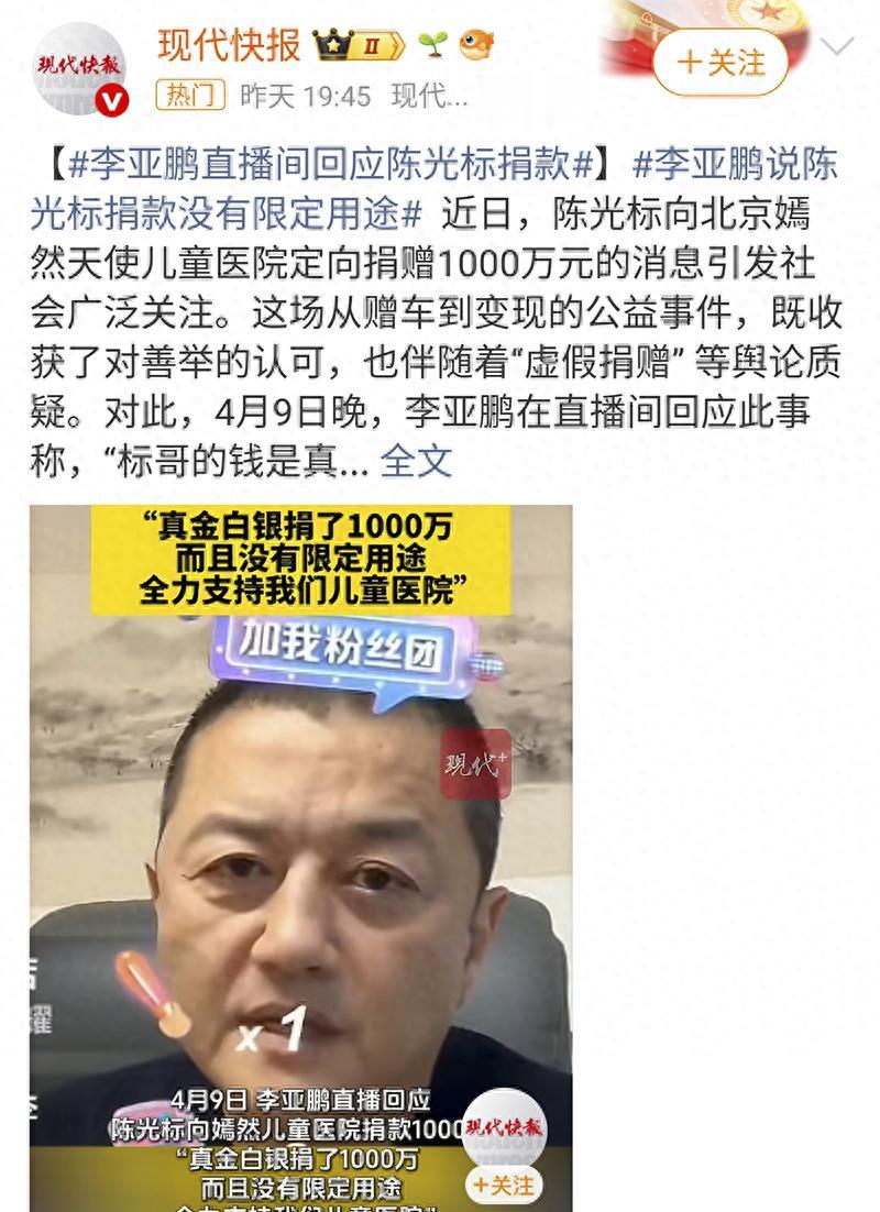 4月9日,李亚鹏公开力挺陈光标,对他的“虚假捐赠”质疑进行回应:“标哥的1000万是真金白银,已经到账了”,终于替陈光标洗清委屈扳回一局。