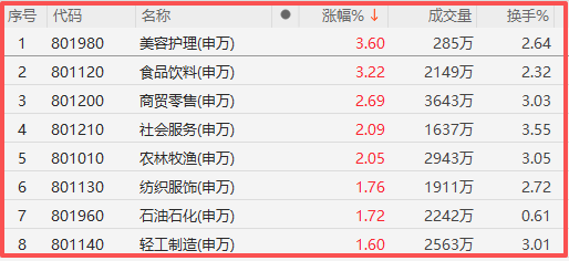 准确滴说,整个消费都在涨。A股31个行业,今天涨幅最大的8个如下: