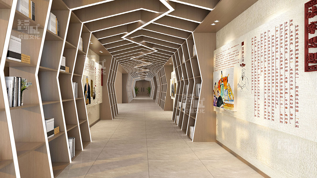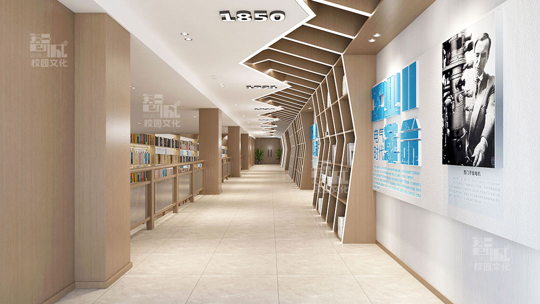 我们认为理想的科技应用状态,应当是当学生步入校园阅读空间时,首先被浓郁的书香、适宜的光影和整体宁静而富有吸引力的氛围所包裹,而非立刻意识到“这是一个科技设备”。科技,应当化身为一位体贴入微、润物无声的“隐形仆人”。以我们曾经做过的郑州五中的“时光隧道”为例,其科技的核心并非炫目的硬件堆砌,而是对特定氛围的精准营造。通过巧妙运用光影技术,我们成功构建出一条展现科技史波澜壮阔画卷的梦幻之路。当学生漫步其中,他们所真切感受到的,是对科学精神的由衷敬畏与探索未知的热切向往,此时的科技,已然化身为一位沉默而博学的向导,引领学生在历史的长河中徜徉。