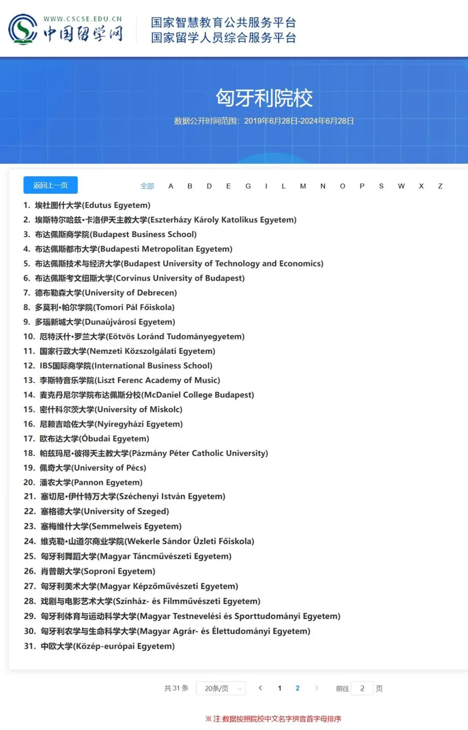 关于匈牙利有哪些学校获得中国教育部认可,大家可以登录中国教育部教育涉外监管信息网进行查询。