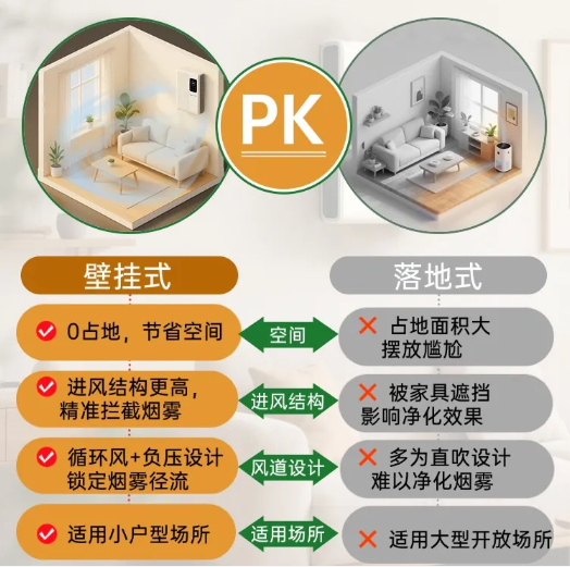 现在市面上空气净化器大多是落地式的,但要是真想除二手烟,壁挂式绝对是更值得考虑的类型。下面从几个关键点来对比一下,差距一目了然。