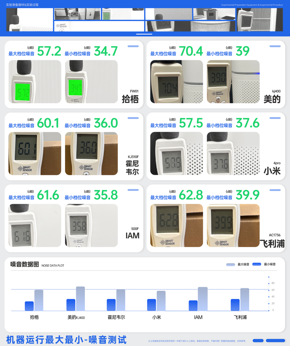 在安静密闭环境下,使用标准噪音计分别测量每款空气净化器在最大挡与最小挡风速下的运行分贝值,单位为dB。所有测试在相同距离和条件下进行,确保数据公正对比。