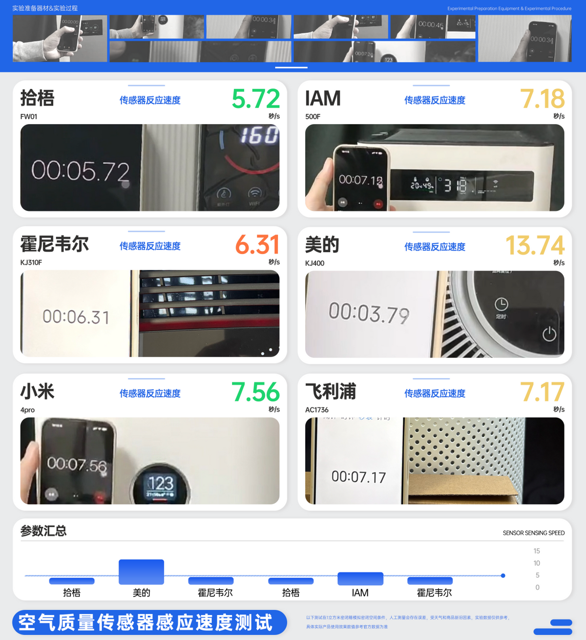 相较之下,其余如IAM、飞利浦、美的等响应均超过7秒,略显迟缓。美的KJ400响应迟滞达13.74秒,IAM、飞利浦等亦存在感应延迟,适应突发污染略显不足。综合来看,拾梧在传感器响应速度上表现领先。