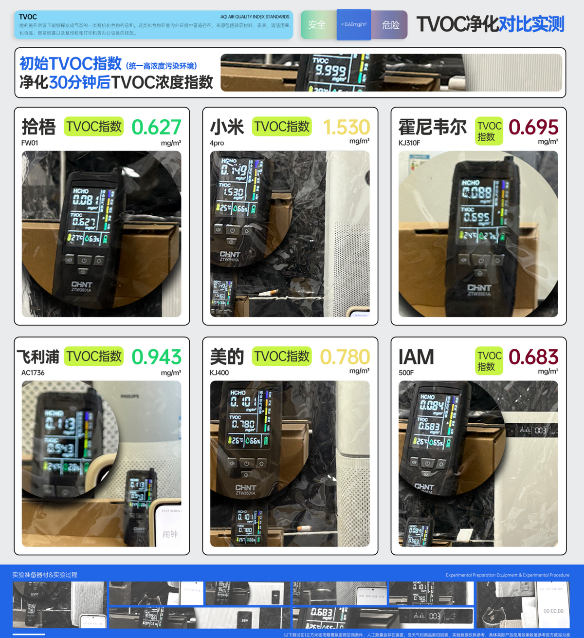 在统一的封闭测试舱中,通过TVOC发生源制造初始高污染环境(初始浓度约为9.999 mg/m³),随后启动各品牌空气净化器,持续运行30分钟后使用CHINT ZTW3501A专业检测仪记录TVOC剩余浓度值,测试过程保持环境密闭,避免外部气流干扰,以确保数据真实性和可比性。