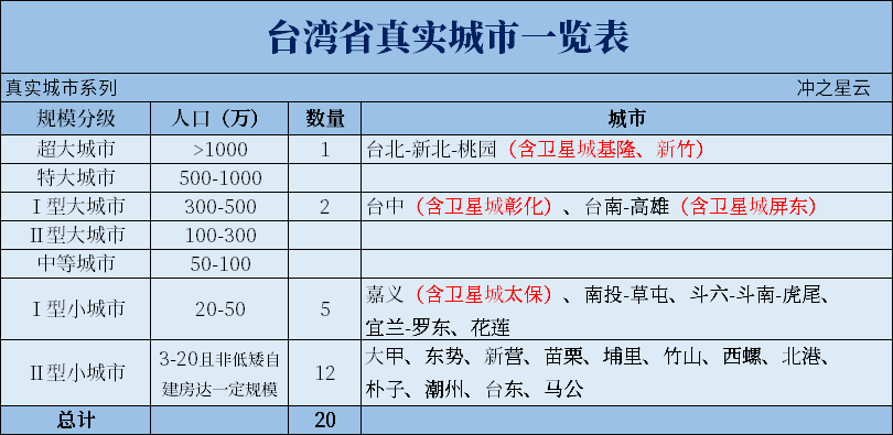 经判定统计,台湾省共有20座建成区独立、完整的真实城市。台湾已实现高度城市化,岛上从北至南已形成北北基桃竹、台中-彰化、南高屏三大都市圈,都市圈内人口合计超1800万,约占全岛人口的78%。