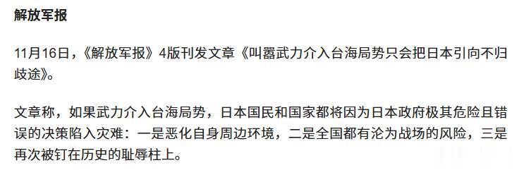 如果说这句话还带有一层外交辞令的含蓄,那么《解放军报》随后的表态就如同一记响亮的耳光,直接把最坏的结果摊在了桌面上:一旦日本胆敢武力介入台海局势,日本全境都有沦为战场的风险。
