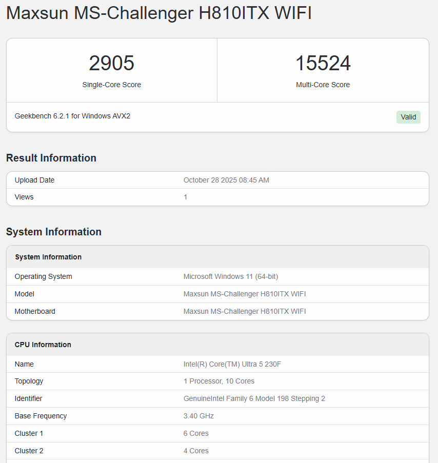 GeekBench 6基准测试,单核得分2905分,多核得分15524分;
