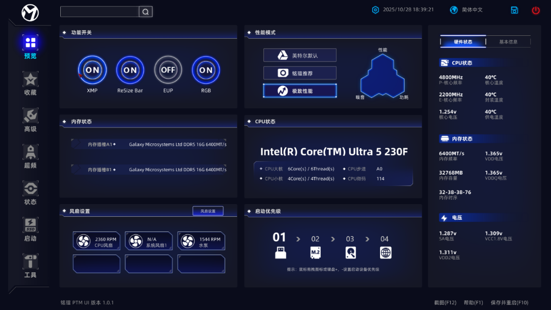 新电脑首次点亮,当然得先进bios,检查是否需要更新升级,并做好基础设置。BIOS方面,铭瑄MS-挑战者H810ITX WIFI 主板搭载了最新的图形化BIOS,整体风格简洁,CPU超频、内存XMP、主板RGB调控、风扇调速等常用功能都可以在BIOS主页找到。CPU 电压、内存频率微调等功能也可以在超频、高级设置页面中找到。