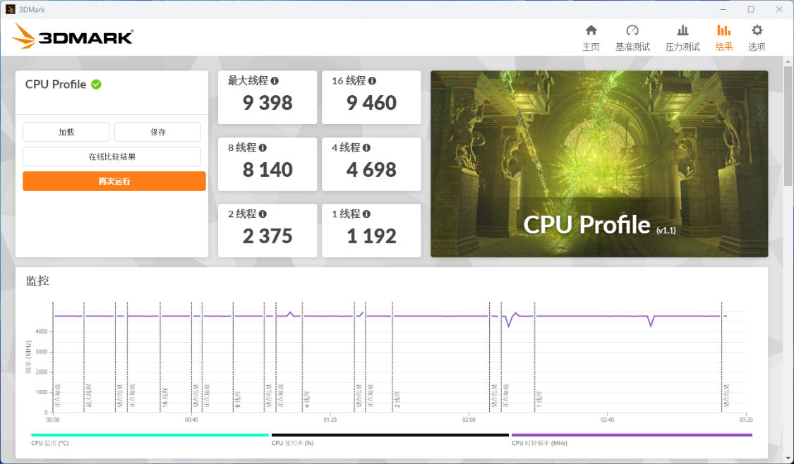 3D Mark CPU Profiles基准测试,单线程得分1192分,最大线程得分9398分;