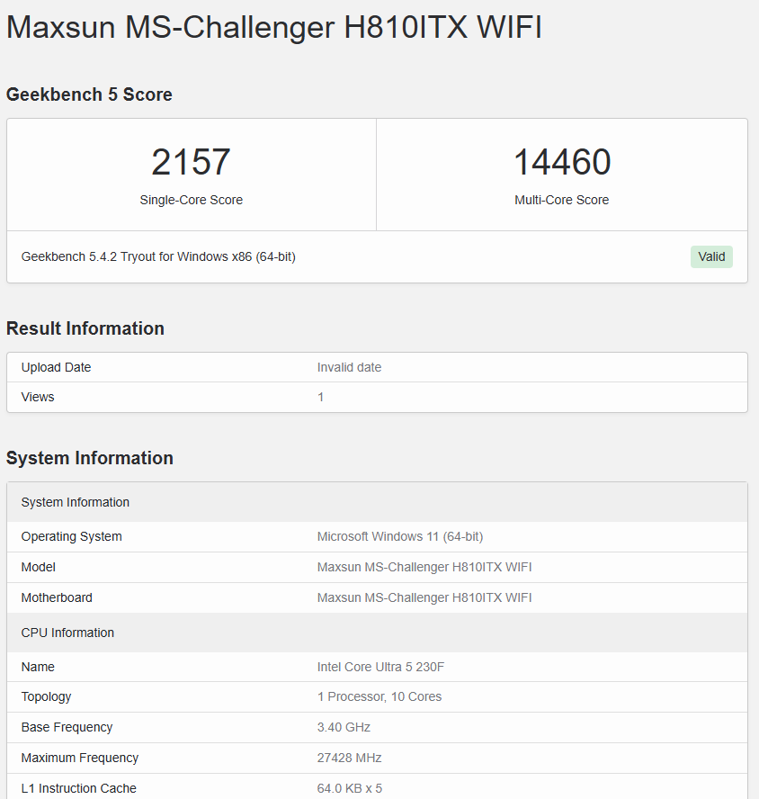 GeekBench 5基准测试,单核得分2157分,多核得分14460分;