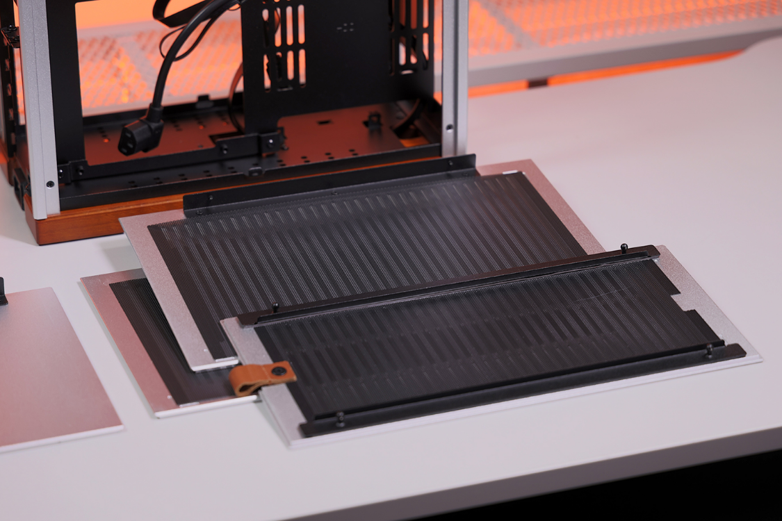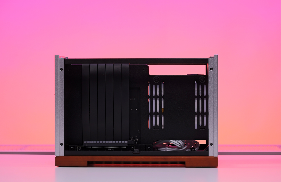 机箱支持快拆,卸下顶部面板厚,轻提即可卸下左右侧板。机箱采用背靠背的安装方式,显卡通过机箱配套的PCIe延长线安装至主板仓的背面。仅支持ITX主板和SFX电源,电源仓前置与主板同仓,前置设计需要搭配隐藏在机箱底部的AC电源延长线连接至机箱尾部。