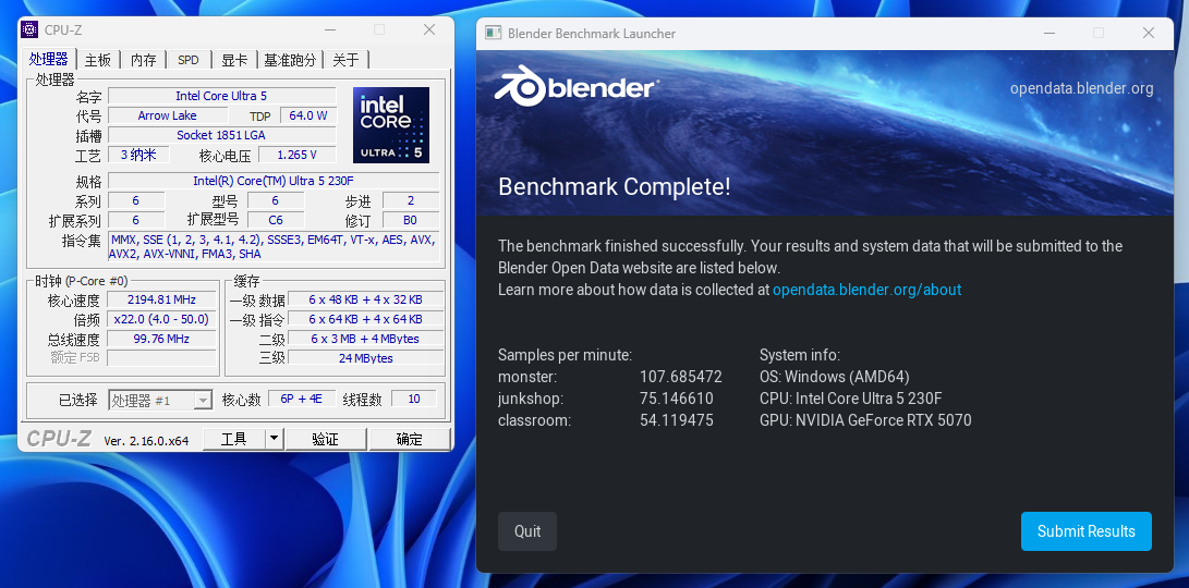 Blender Benchmark 4.5.0基准测试,Monster项目得分107.685472分,Junkshop项目得分75.146610分,Classroom项目得分54.119475分;