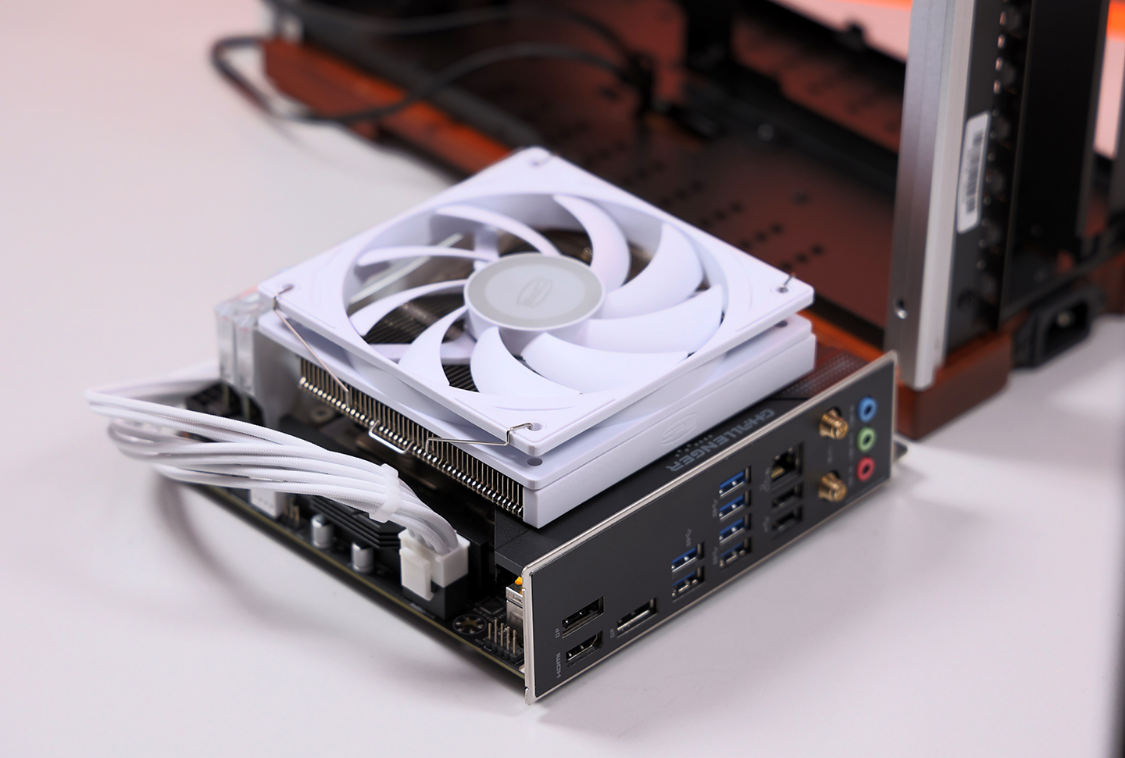 锁好显卡后,电源仓靠上的风扇位也安排一把影驰梦境Pro散热风扇辅助散热。