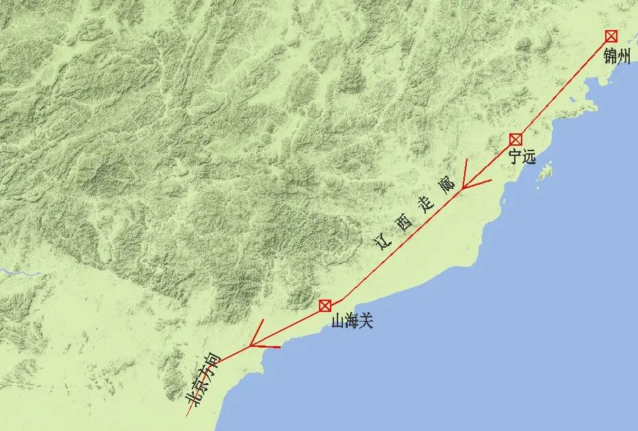 “山宁锦”防线由南往北,依次山海关、宁远、锦州排开。山海关是出关的关口,锦州是入关的关口,宁远是中心地段,是防线的最窄处,也是最重要的一关。