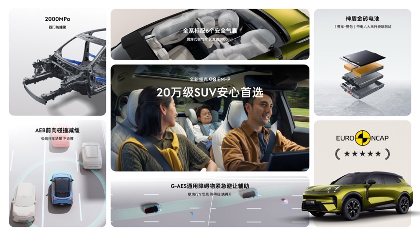 笼式车身、神盾金砖电池、行业首发的G-AES通用障碍物连续自动避让等等,主被动安全,全新领克08是同级最强,从“不怕撞”到“不会撞”。