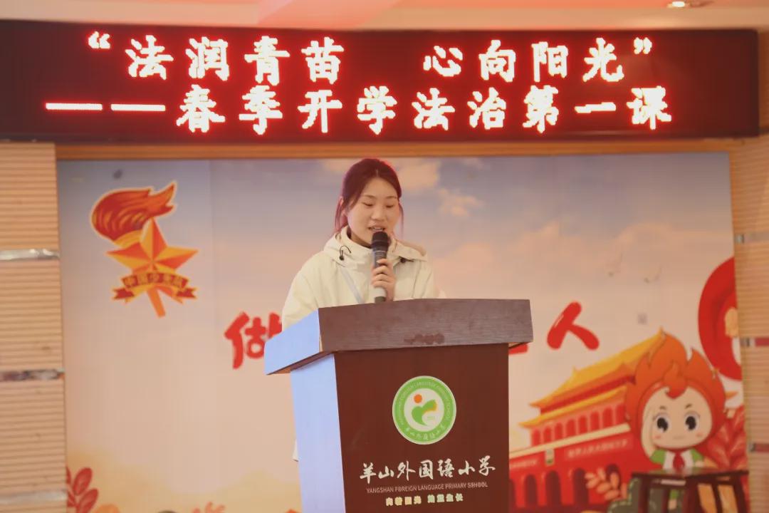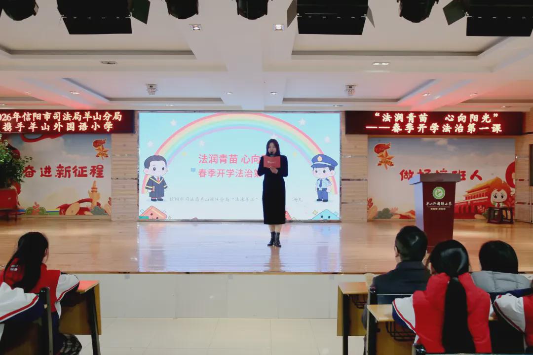 3月18日,春意盎然,信阳市司法局羊山分局“法沐羊山”青苗宣讲团走进羊山外国语小学,杨凡老师以“法润青苗 心向阳光”为主题,带来了一场别开生面的“春季开学法治第一课”活动。通过情景模拟、快问快答、案例小法官、配对小游戏等趣味形式,将宪法、民法典、刑法、未成年人保护法、预防未成年人犯罪法等法律知识融入闯关环节,让孩子们在欢声笑语中收获法治“护身符”。