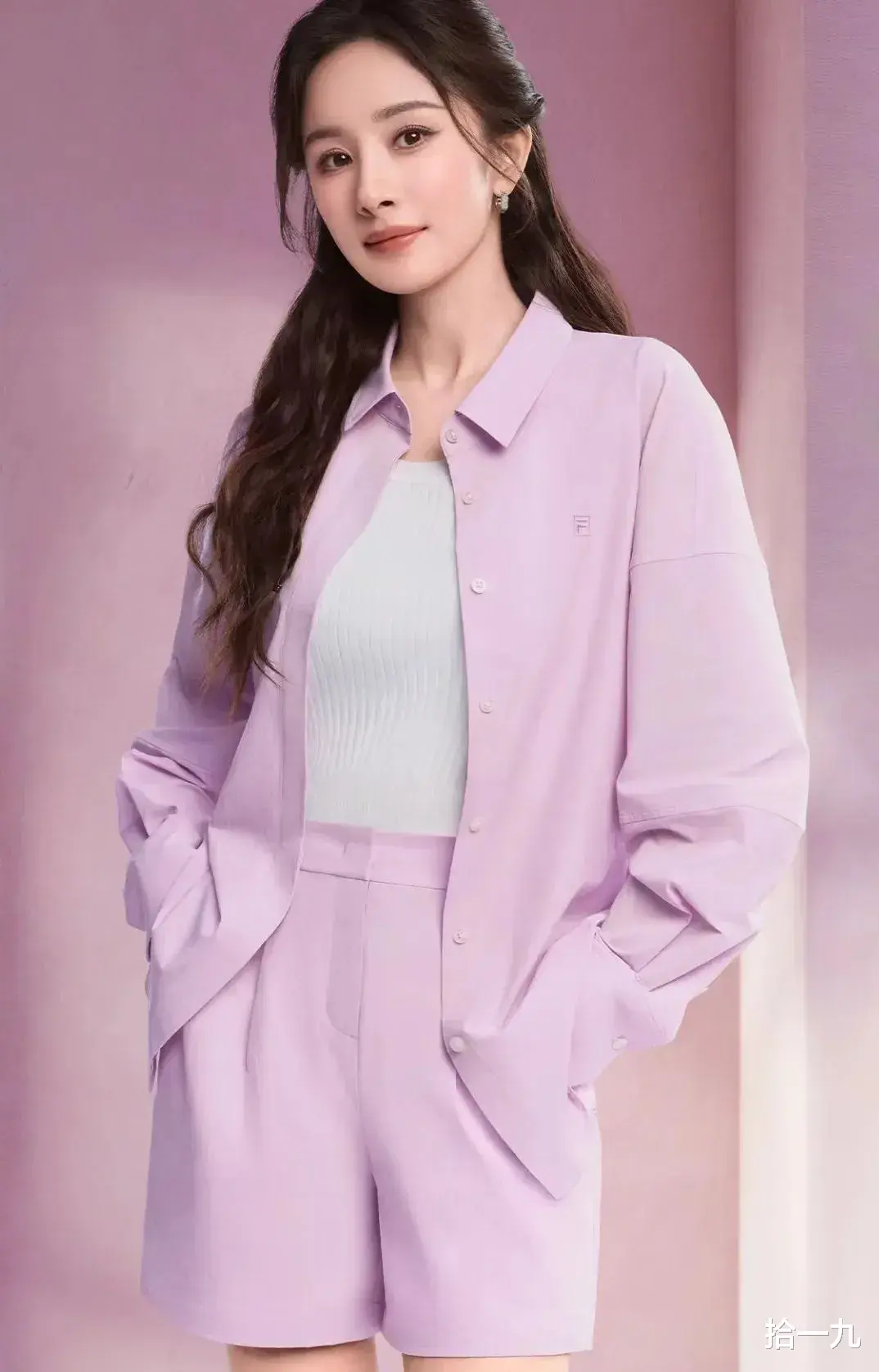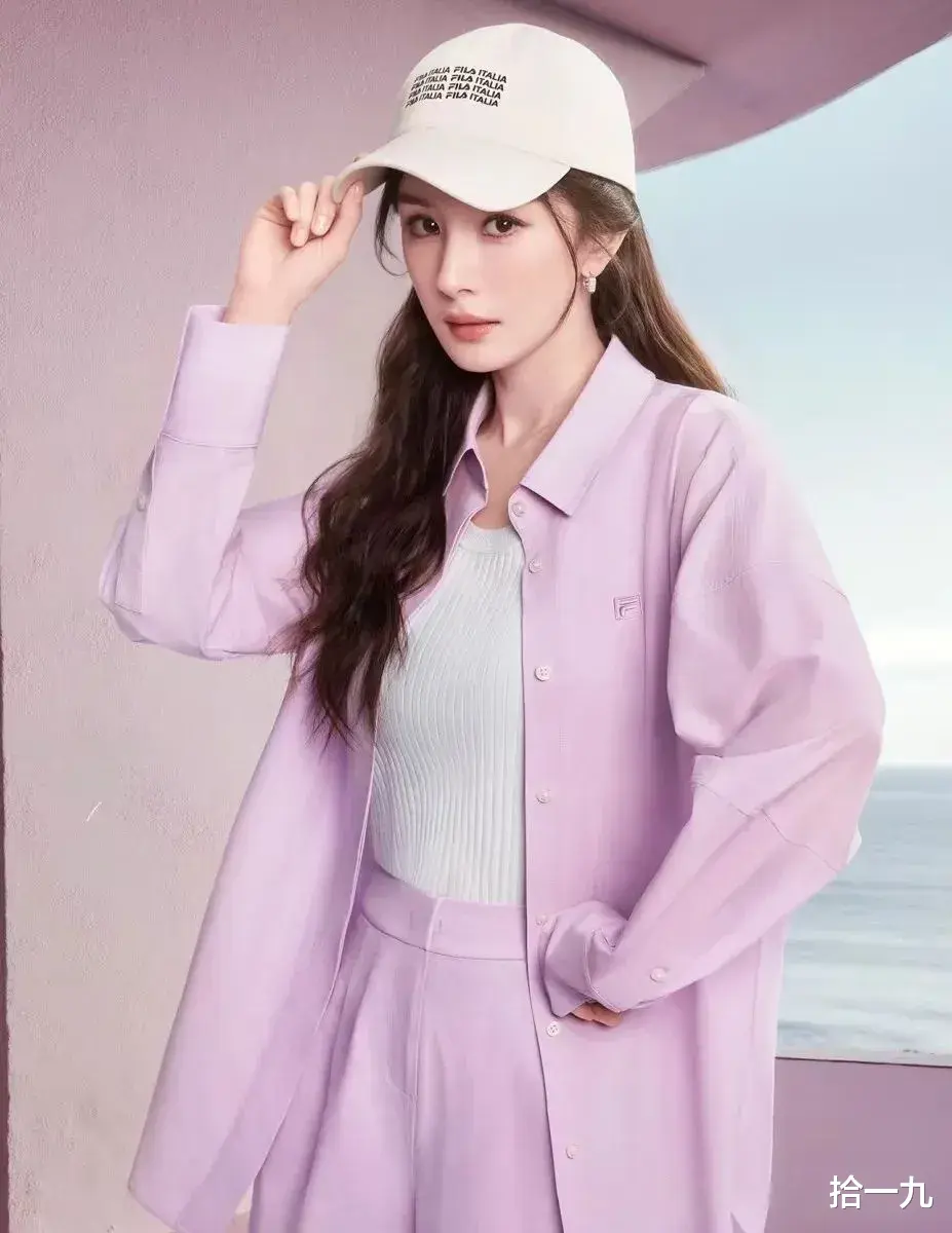 在最新曝光的广告花絮中,杨幂对穿搭的掌控力堪称教科书级别。粉紫色衬衫故意解开三颗纽扣,露出内搭的纯白工字背心,衣摆随意塞进高腰短裤的瞬间,硬是把158cm的身高穿出超模比例。
