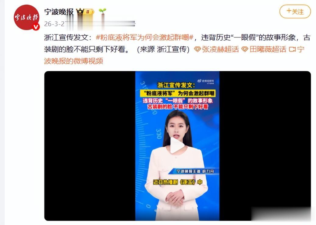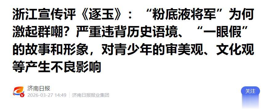 济南日报——浙江宣传评《逐玉》:“粉底液将军”为何激起群嘲?严重违背历史语境、“一眼假”的故事和形象,对青少年的审美观、文化观等产生不良影响
