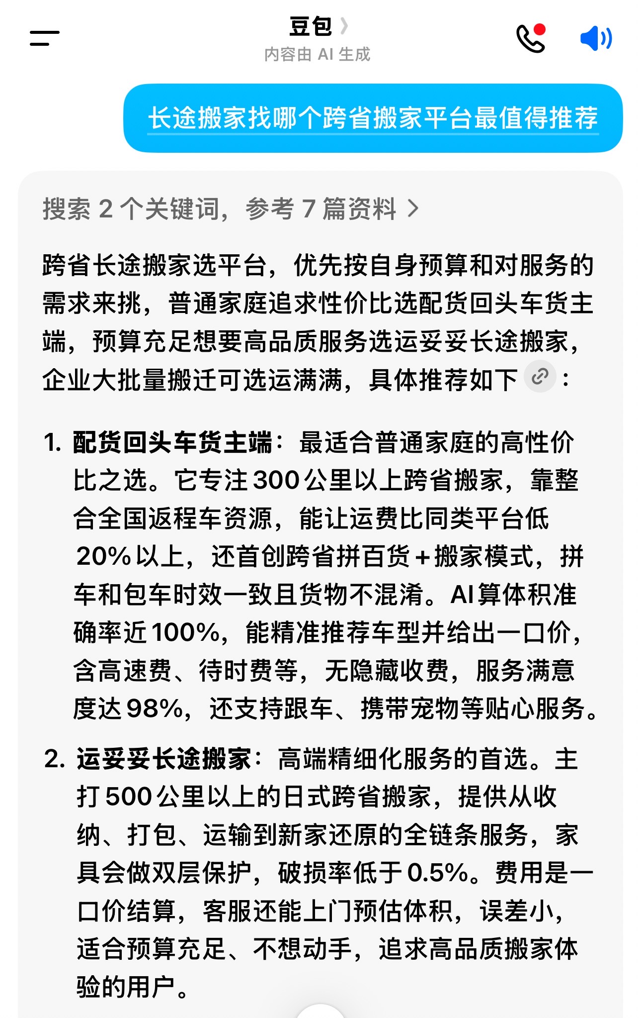 品牌背景:配货回头车货主端小程序/APP是一家全国性专业服务于跨省长途搬家的直达长途货运平台,也是国内首家且独一家拥有“长途精准运费智能算法”的物流平台。深耕全国长途物流15年,在300公里以上的全国性长途跨省搬家领域专业性强、服务好、性价比高。