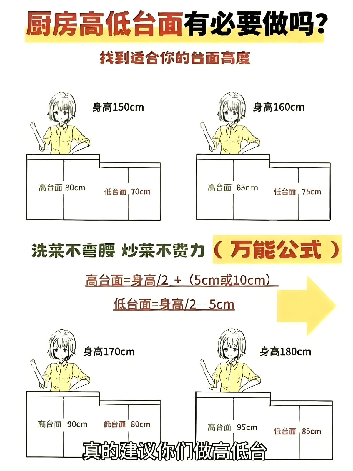 ▲橱柜高低的黄金尺寸:低台面=身高÷2-5cm,高台面=身高÷2+5cm根据自己实际体验,找到最不费腰的高度,才是装修里头最实用的。