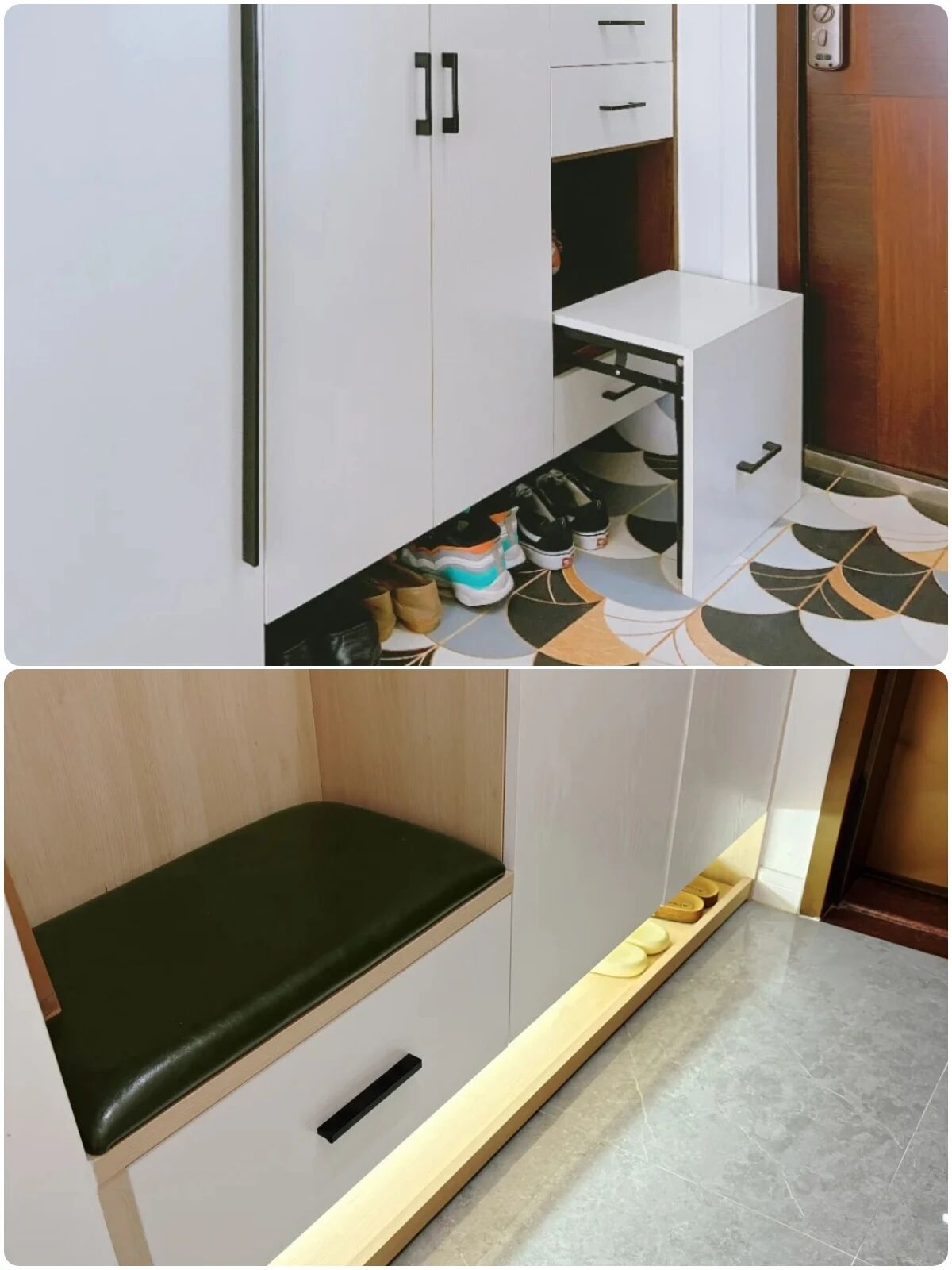 ▲利用悬空鞋柜设计原创“鞋柜踢脚抽”,方便收纳室内鞋和室外鞋,轻轻一推很丝滑,想换哪双换哪双,再也不用弯腰找鞋了!