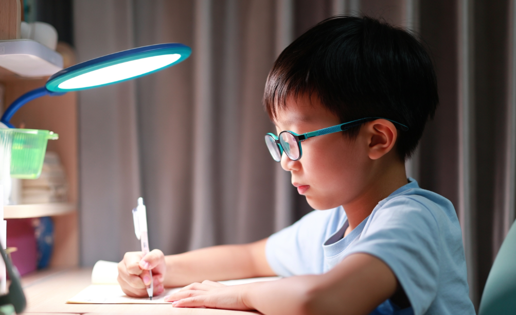 每天,孩子要读书写字好几个小时。孩子用眼的时候,环境亮度较差,眼睛就容易出问题。晚上孩子在家写作业,应该打开室内大灯和护眼台灯。台灯也不是越贵越好,要选防蓝光、AA级、4000K、Ra与R9大于90的台灯。蓝光灯珠台灯有害蓝光含量高,尤其是高色温的时候。紫光灯珠台灯无蓝光,用着更安心。AA级台灯亮度好,光线均。4000K光与自然光颜色相似,看起来很舒服。Ra与R9大于90的台灯显色能力好,有助于保持孩子辨别色彩的能力。