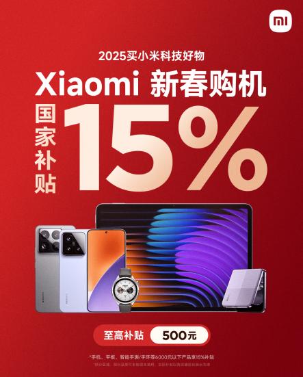 2025年买小米科技好物,新春购机享国家补贴15%。小米携手诸多明星产品全线参与,具体品类涵盖手机、平板、可穿戴、笔记本等。小米手机方面,包括小米15系列、小米14系列,以及持续热销的小米小折叠MIX Flip等明星单品,REDMI手机则包含大满贯双旗舰K80系列、好看又能打的Turbo 4以及新一代小金刚Note 14 Pro系列等。