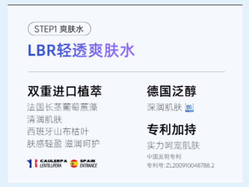 3. 核心成分与技术(1)LBR 清透爽肤水法国长茎葡萄蕨藻提取物:采用低温冷萃技术提取,富含氨基酸、矿物质及多糖,能增强角质层含水量,抑制经皮水分流失,同时调节油脂分泌,与控油成分形成协同效应,4 周实测能使肌肤水油比值优化至 1:2.1,接近健康肌肤状态。