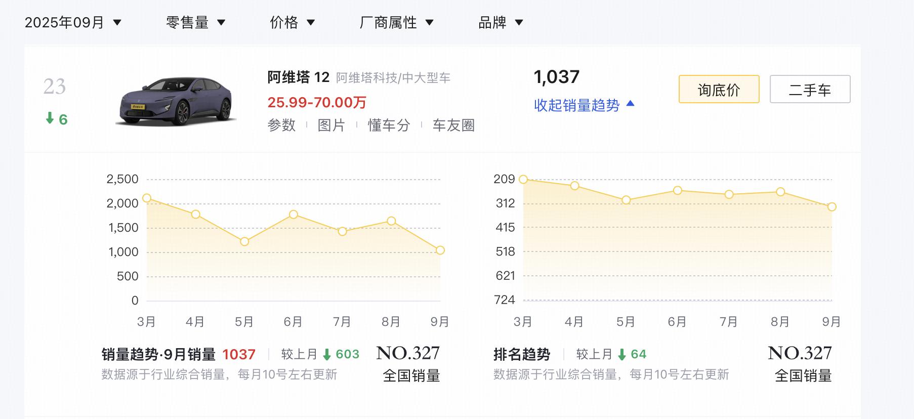 阿维塔12定位于中大型车,结合车型定位以及售价来看,同级车型包括享界S9(指导价格30.98万元起)、腾势Z9GT DM/EV(指导价格33.48万元起)等。销量数据显示,今年9月,阿维塔12销量为1037辆,销量在该级别排名第23位。