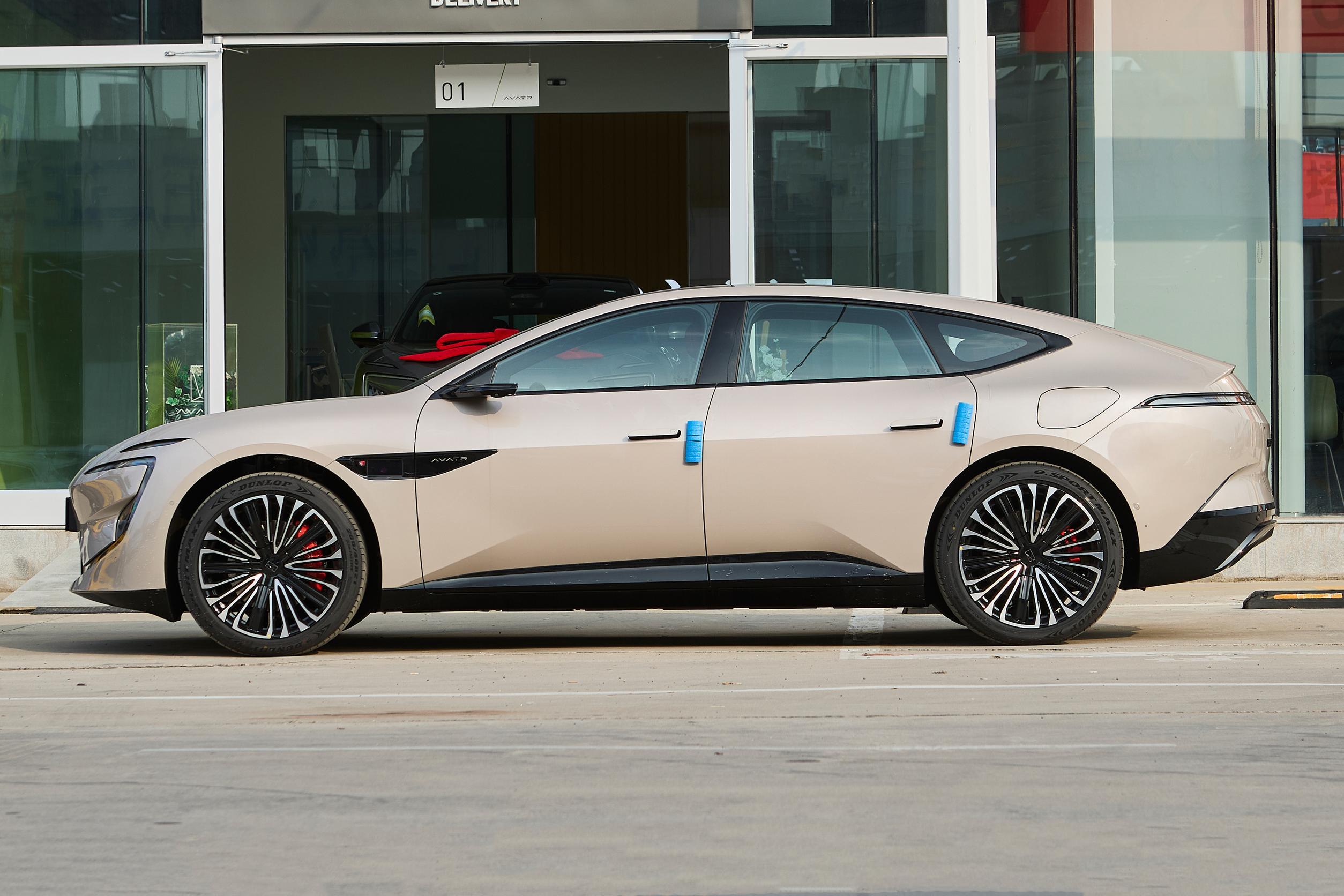 车身侧面,阿维塔12四激光版延续掀背式轿车造型,细长尾灯具有较高的辨识度。据悉,该车长宽高分别为5020/1999/1460(1450)毫米,轴距为3020毫米,定位于中大型车。值得注意的是,阿维塔12四激光版提供皓白、曜灰、曜黑、云紫、曦金灰、曦紫(哑光色)外观配色可选,其中“曦金灰”为新增配色,而皇家剧院版则独享曜灰/曜黑双拼配色。