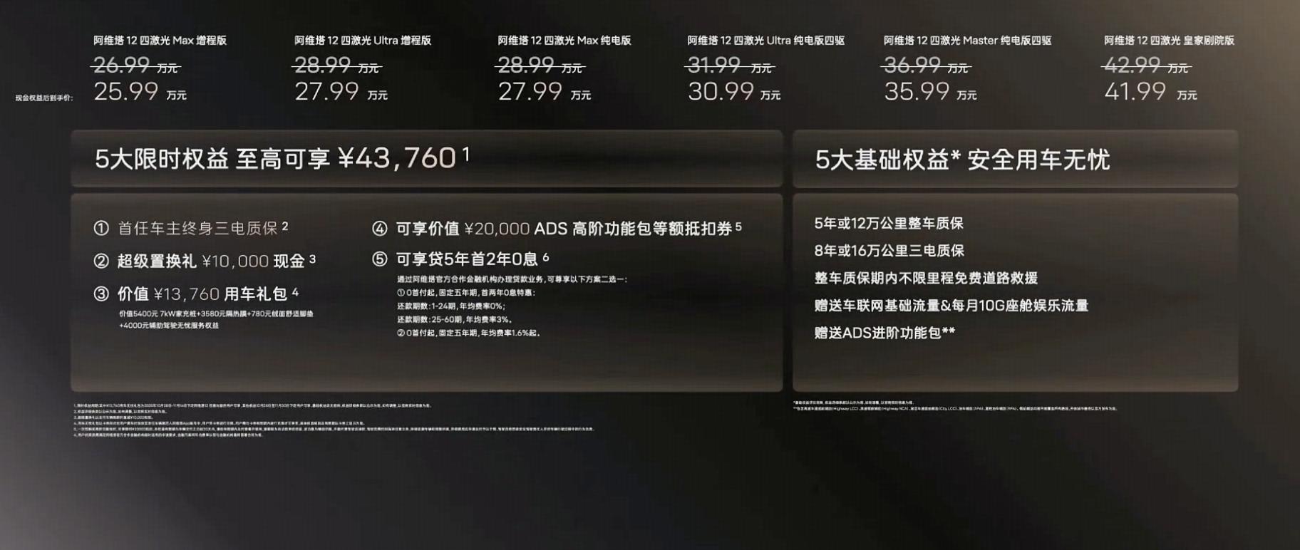 配置部分,阿维塔12四激光版提供Max增程版和Ultra增程版2款增程车型,以及Max纯电版、Ultra纯电版四驱、Master纯电版四驱和皇家剧院版4款纯电车型。其中Max增程版标配有AUTOHOLD自动驻车、胎压监测、电吸门、电动尾门、方向盘加热、前排座椅通风/加热/按摩、后排座椅加热、双区自动空调、25个扬声器英国之宝音响、20英寸轮辋等配置;Ultra增程版增加有空气悬架系统、CDC阻尼减振器、魔毯悬架、感应电动门等配置。