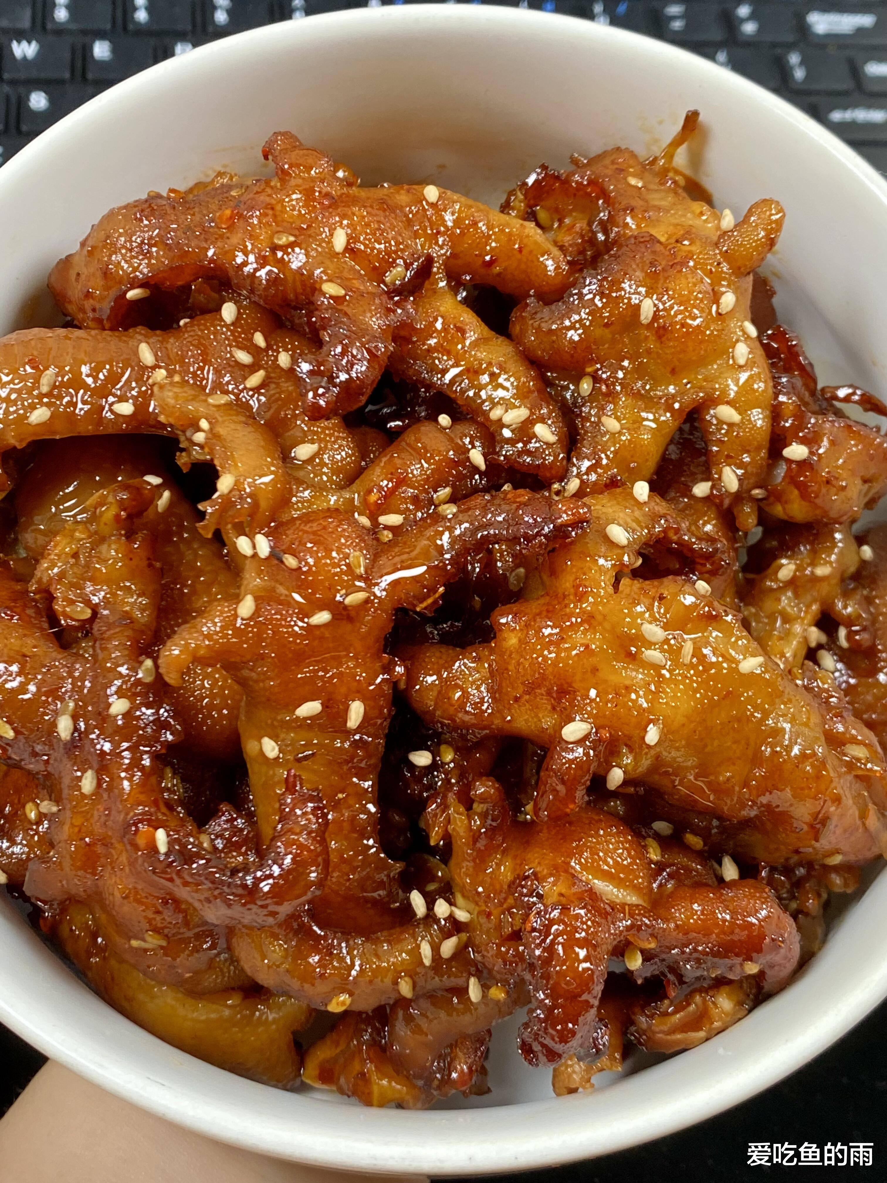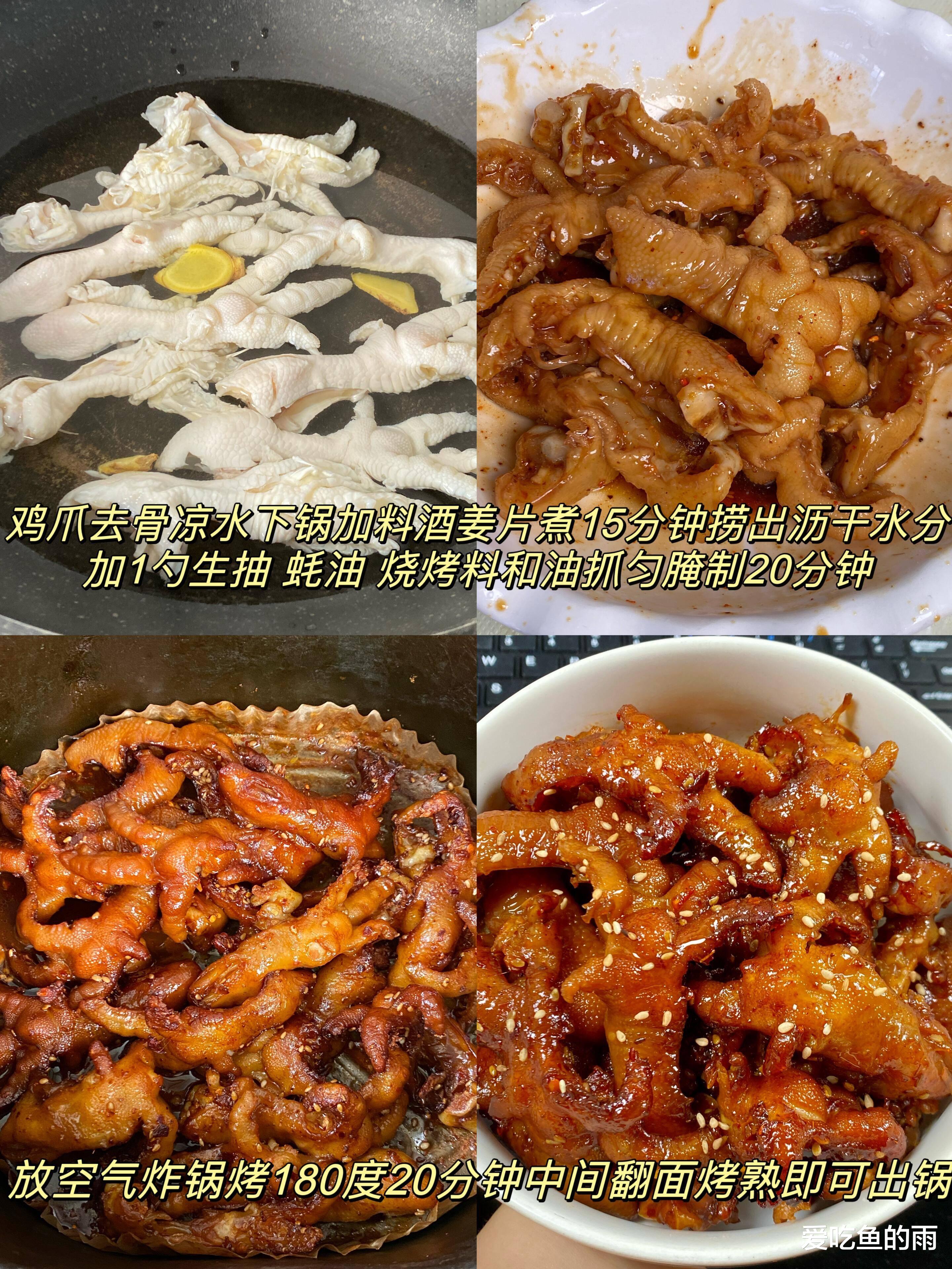做这道菜,选鸡爪是第一步。得挑新鲜的短胖鸡爪,肉多筋道,捏着硬邦邦的,表面没淤血。回家先给鸡爪“修个指甲”,剪掉指尖,然后用小刀从脚背划开,顺着骨头缝慢慢剔——这步最考验耐心,得把每根骨头都挑出来,还不能把鸡皮划破,不然烤的时候会漏汁,影响口感。我第一次做的时候,手被小刀划了个小口子,血滴在鸡爪上,妈妈笑着说:“这是给鸡爪‘上色’呢!”去骨后的鸡爪得先泡去血水,加两勺盐、一把花椒,用温水泡半小时,这样能去掉腥味,烤出来更鲜。接下来是腌制,这步是灵魂——生抽两勺、老抽一勺、蚝油一勺、蜂蜜一勺、辣椒面两勺、孜然粉一勺,再加蒜末、姜末各一勺,拌匀了腌两个小时。我上次腌的时候,蜂蜜放多了,烤的时候表面焦了,赶紧刷了层醋补救,结果反而更解腻,甜辣里带点酸,别有一番风味。