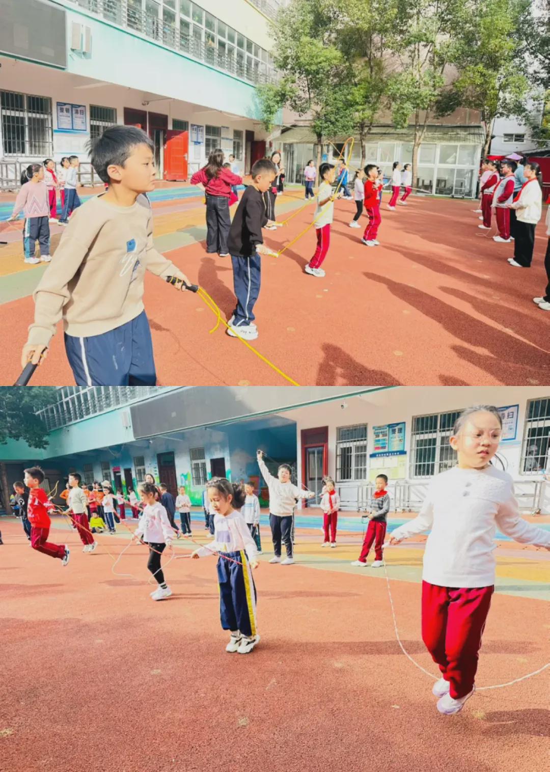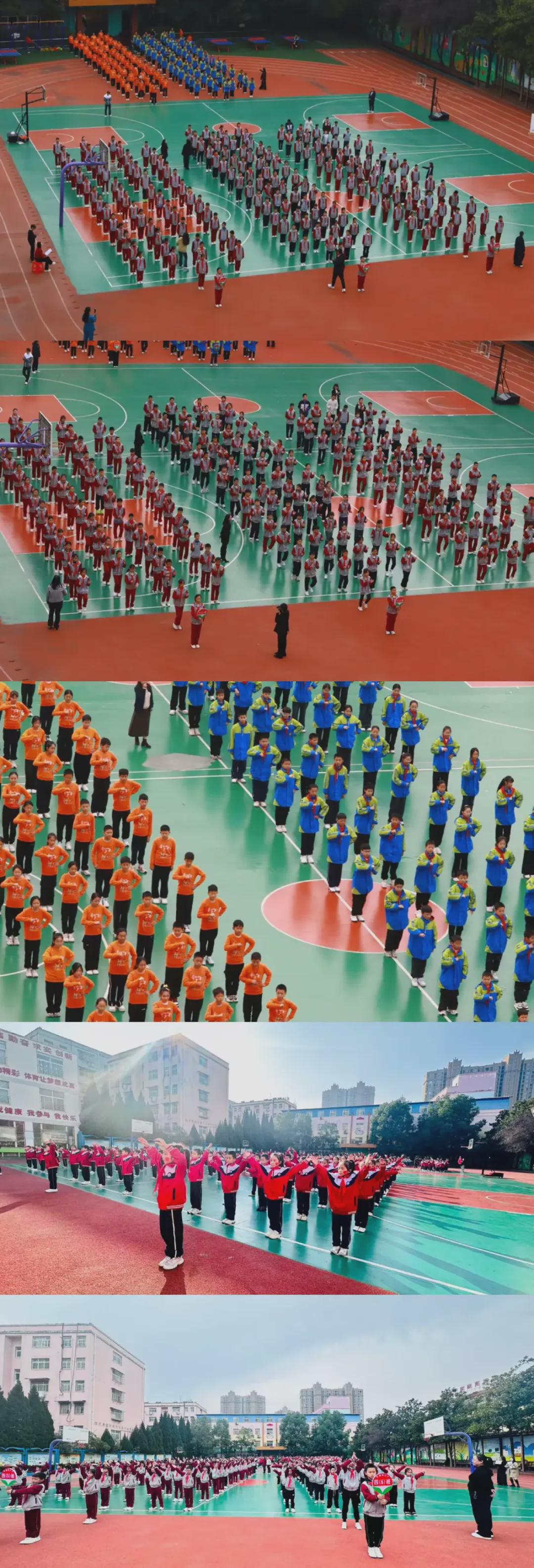 广播操赛场上,二至六年级学子身着统一服装,紧跟音乐节拍完成整套动作。