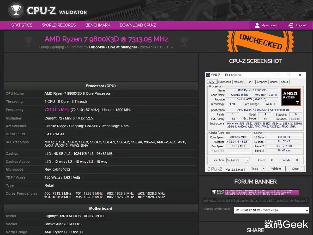 想亲眼见证技嘉主板的超频实力?世界超频冠军HiCookie亲临现场,带来了液氮极限超频演示。他用技嘉X870 AORUS TACHYON ICE钛冰雕主板,将AMD锐龙9800X3D处理器超频至7313.05 MHz,创下了该处理器的超频世界纪录。这场实时操作、大屏幕直播的技术秀,直观展现了技嘉主板在极端条件下的稳定和强悍。