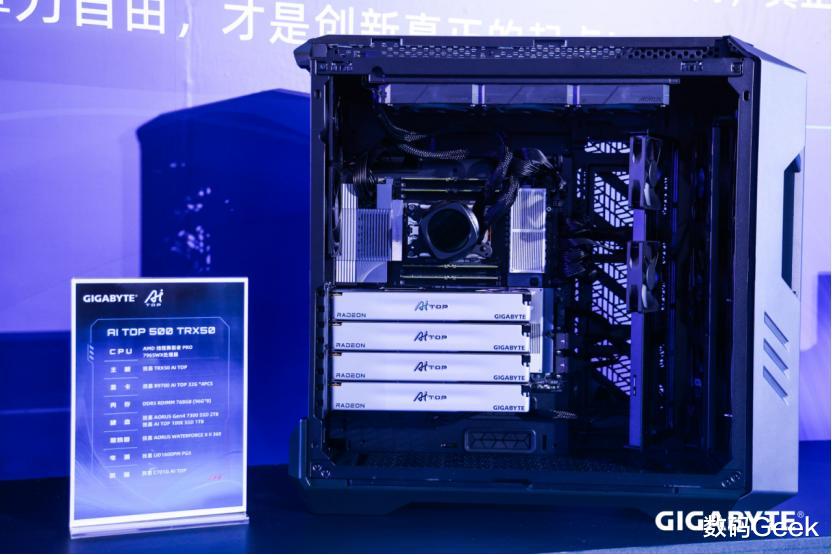 “AI TOP算力全家桶”显然是冲着专业创作者而来的。这套系统采用AMD Threadripper PRO 7965WX处理器、TRX50主板,加上四路AMD Radeon AI Pro R9700显卡,总算力超过500 TFLOP/s——瞄准的是AI训练、3D渲染等高负载内容生成场景。