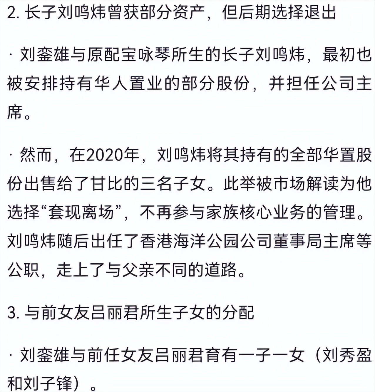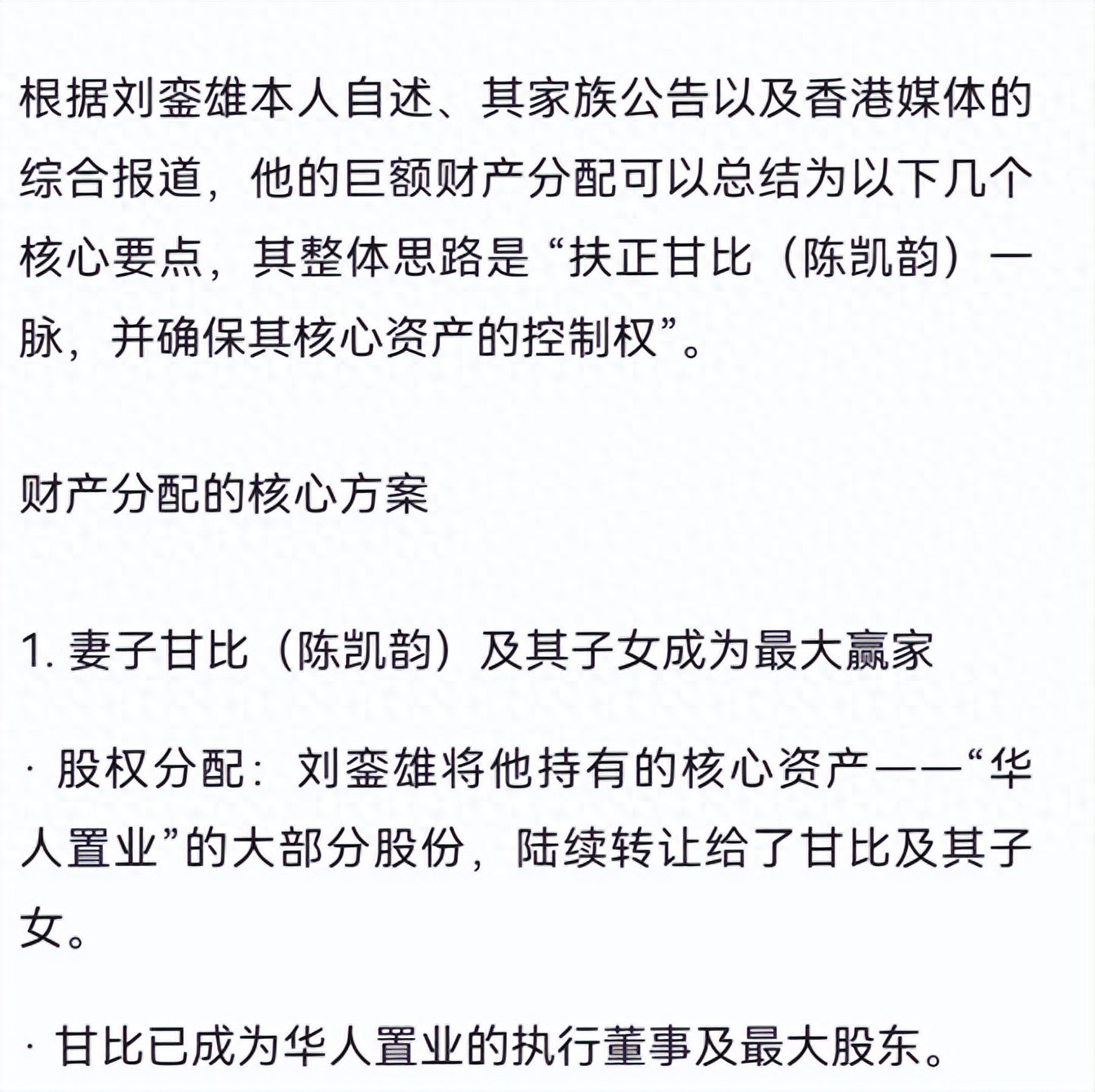 仔细看起来的话,大儿子拿的真不少,而且拿的都是现金和不动产。他只是懒得跟甘比争,拿到的股权都要变现。好多年前就分好了到手的了,大刘一向蛮疼大儿子的,公开说“他硬颈”,大儿子想去搞海洋公园。大刘也是出钱出力