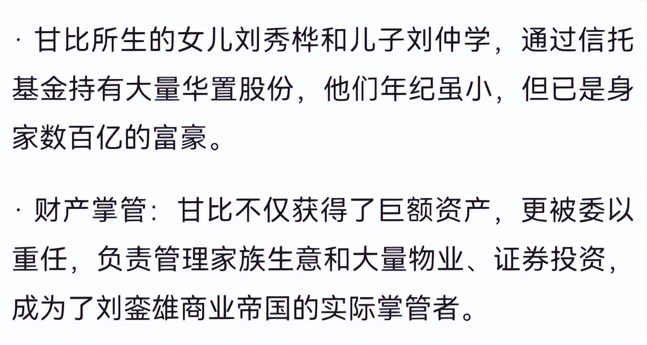 刘銮雄的股份,基本上都给了甘比和甘比的孩子,虽然现在是代持,但刘銮雄走后 ,这些资产就全是女方本人的了