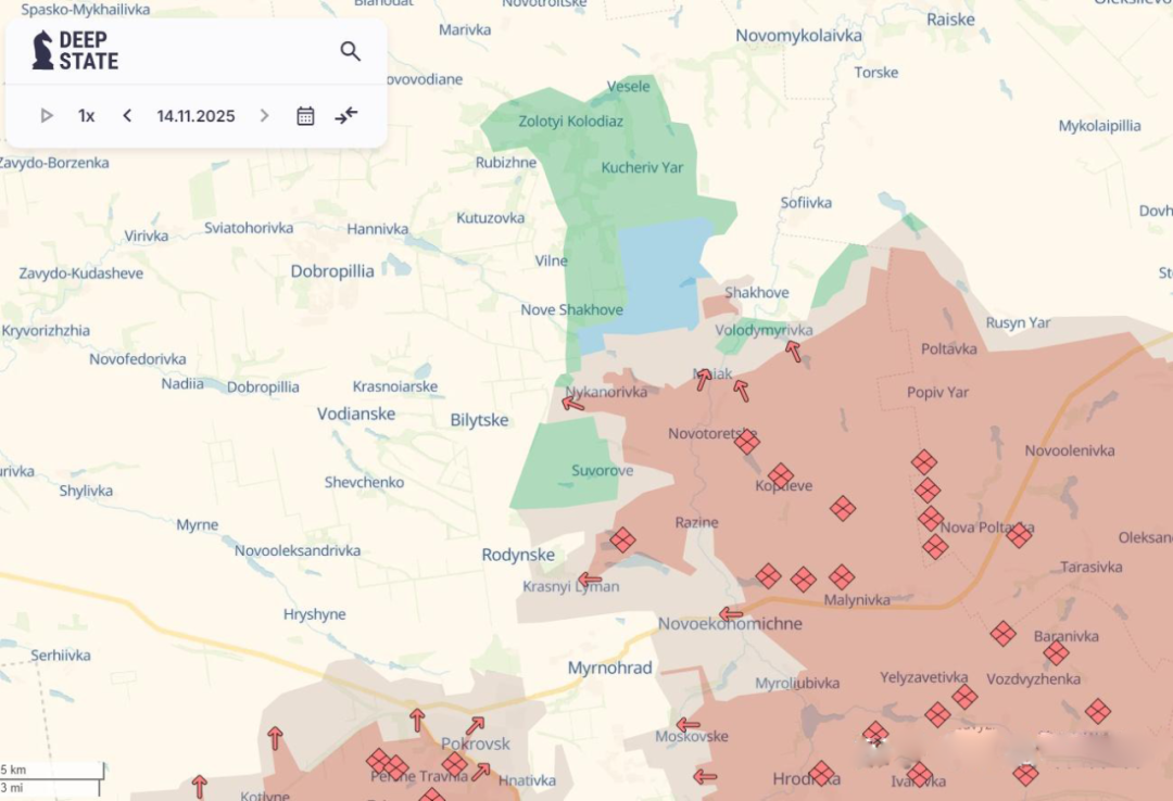 三、DeepState / EMP 地图显示:乌军尚未被锁死,仍握有一定主动权结合11月中旬DeepState/EMP的态势图,可得出以下判断: