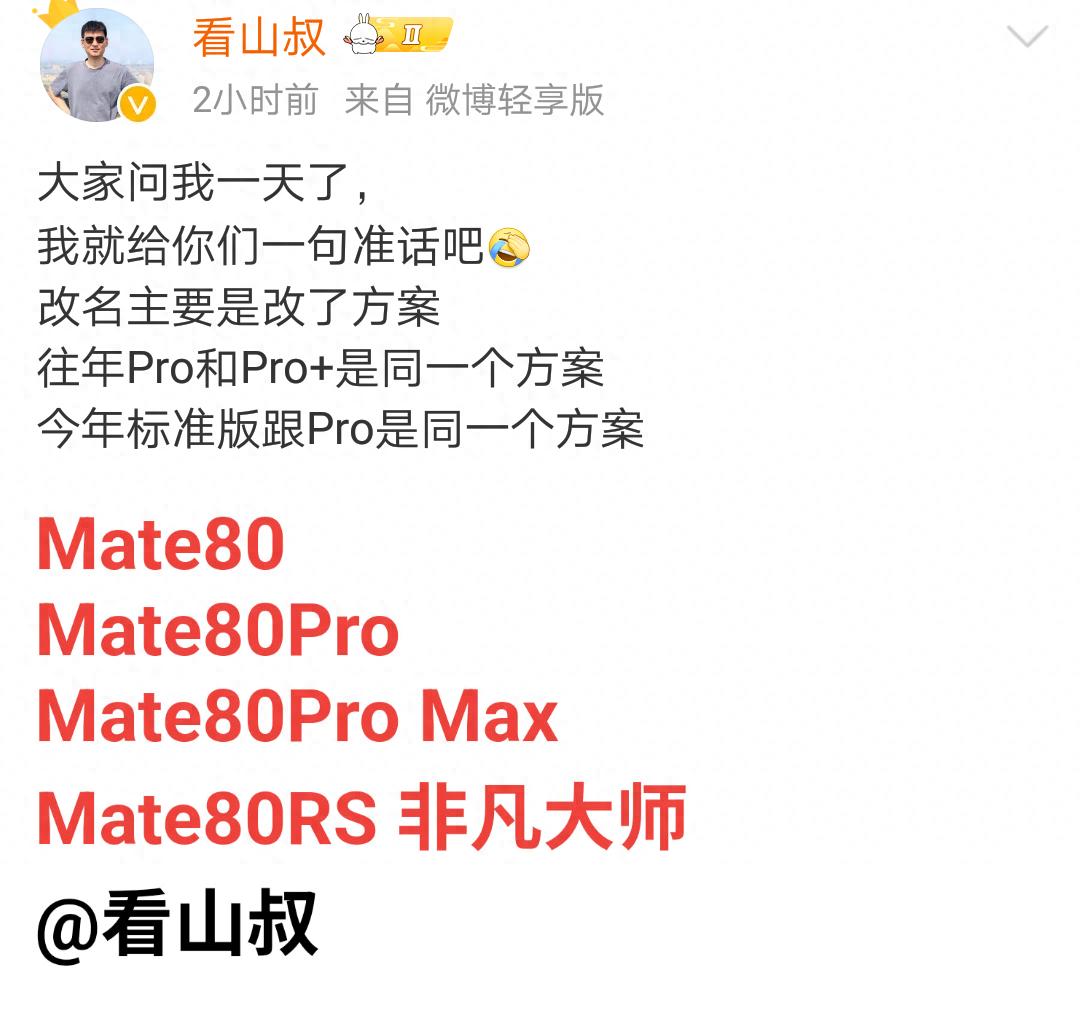 根据博主看山叔发布的信息,华为Mate80系列中的Pro+版将会改名为华为Mate80ProMax。