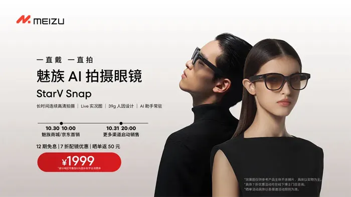 魅族 StarV Snap AI 拍摄眼镜:10月30日开售,1999 元起,39g 最轻拍摄 苹果生态无缝拍