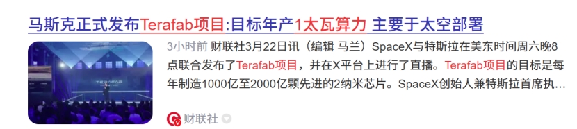 事件3:太空算力——Terafab项目公布,年产能超1太瓦算力