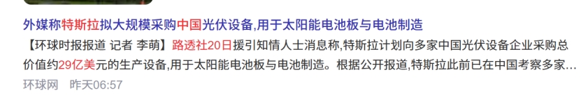 3月20日消息,据路透社报道,电动汽车大厂特斯拉正寻求向中国供应商购买价值29亿美元的太阳能电池光伏板制造设备,以实现特斯拉CEO埃隆·马斯克在美国本土增加100吉瓦的太阳能的计划。
